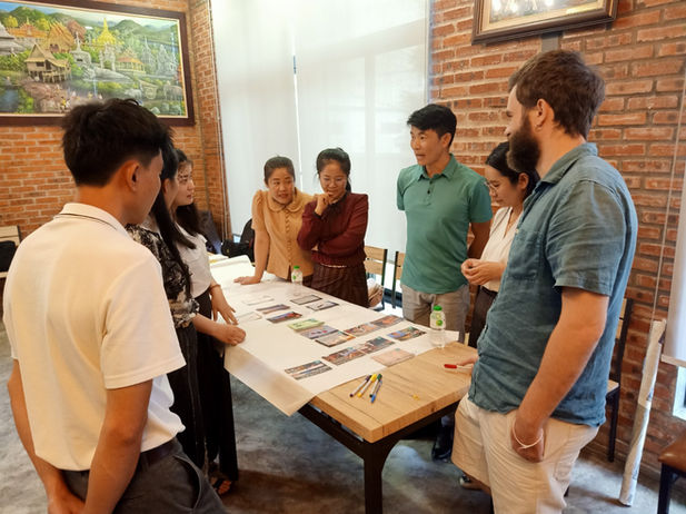 Climate Fresk is an engaging group activity using cards to explore cause-and-effect relationships in climate-related topics such as human activities, fossil fuels, CO2 emissions, absorbent gases, and environmental disasters. Participants collaboratively order the cards, fostering discussions and sharing opinions. This professional and educational game enhances understanding of climate issues and encourages meaningful dialogue on the impact of human activities on the environment All of its information in the cards, come from the IPCC reports, originally in English, but it was translated in Lao for the training.